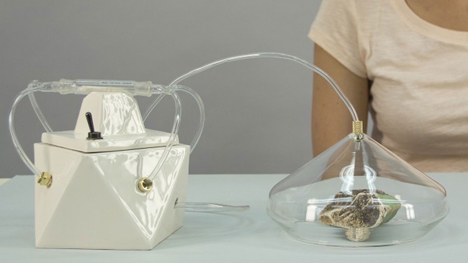 Quando um objeto é colocado debaixo do cone de vidro, a bomba extrai o cheiro através de um tubo e este é absorvido pela armadilha de resina.