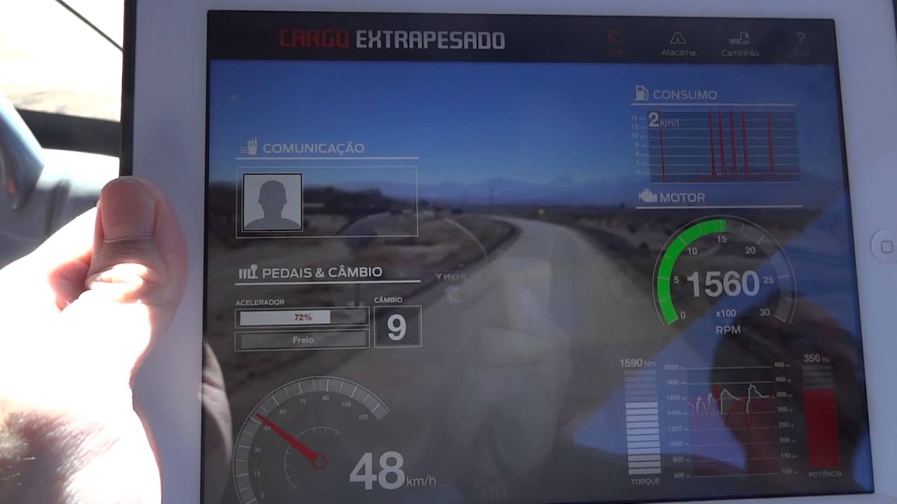 Por ter sido escolhido como Grupo C, fui direto para o ônibus que acompanhava a carreata. Lá encontrei um iPad e um aplicativo bem desenhado que mostrava algumas funções do caminhão que andava a frente de nós. Era possível observar a aceleração, frenagem, câmbio, velocidade. consumo, RPM e incrivelmente a visão do motorista em um vídeo transmitido em tempo real.