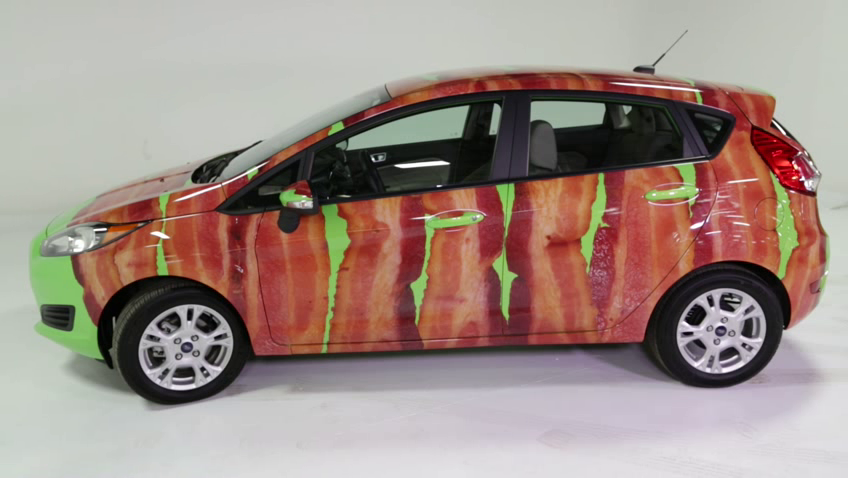 Para celebrar o Dia Nacional do Bacon em 31 de agosto, a Ford envolveu seu New Fiesta em 10 decalques de bacon.