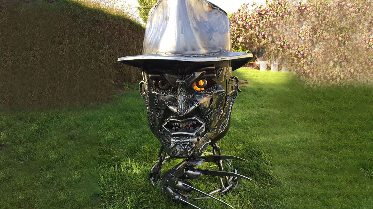 Esta fogueira a lenha é uma réplica da distinta cabeça de Krueger e suas luvas afiadas servem como pernas para o fogão.