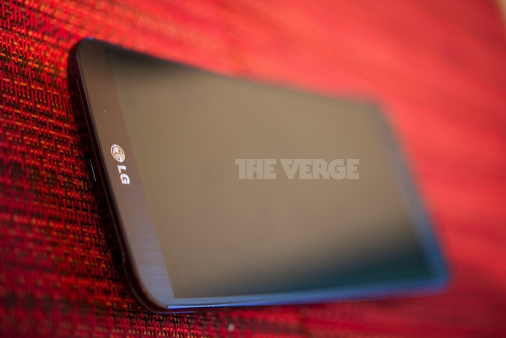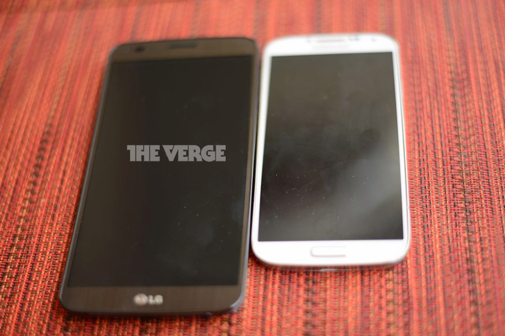 A tela aparentemente mede 6 polegadas e ele possui botões na parte traseira, assim como o LG G2.