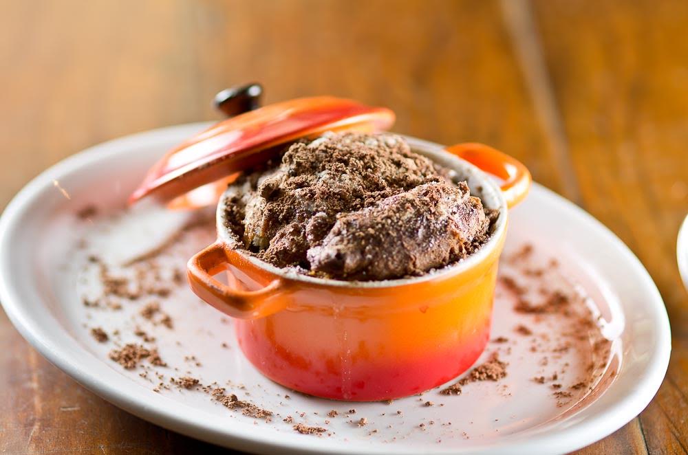 Leve ao forno por 25 minutos. Após tirar do forno, polvilhe açúcar de confeiteiro e cacau em pó sobre o pudding.