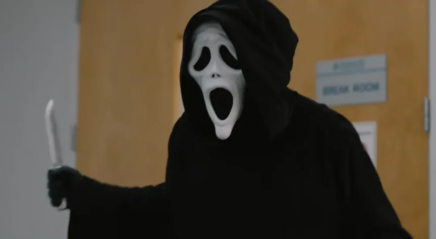 A prévia começa com uma cena caótica dentro de um metrô cheio de assassinos famosos do cinema. Entre as referências aparecem figuras inspiradas em personagens clássicos como Jason Voorhees, Leatherface e até a boneca M3GAN. Mesmo assim, a verdadeira ameaça continua sendo a versão totalmente absurda do assassino mascarado Ghostface, símbolo da franquia.