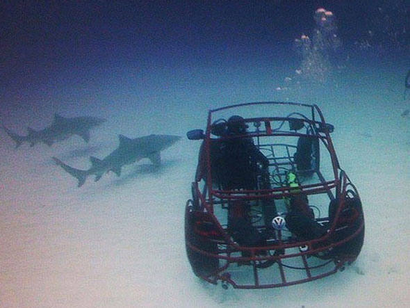 Em parceria com o Discovery Channel, a Volkswagen exibiu uma versão anfíbio do New Beetle que serve como gaiola para mergulhadores que ue desafiam a morte à procura de tubarões.