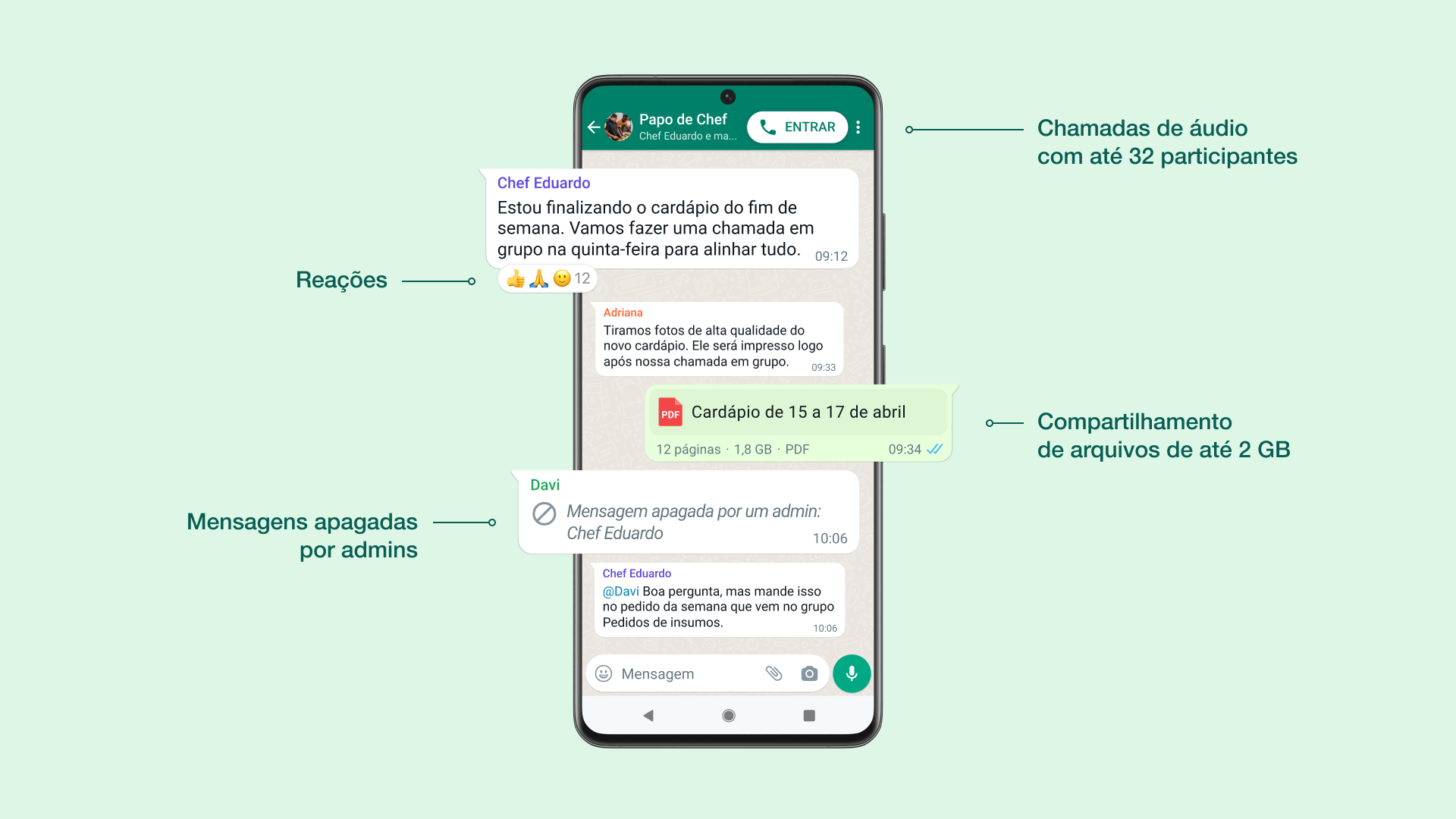 - Chamadas de voz com mais participantes: disponibilizaremos chamadas de voz em que até 32 pessoas poderão entrar com apenas um toque, com um design totalmente novo, para aquelas horas em que falar ao vivo é melhor que por escrito.